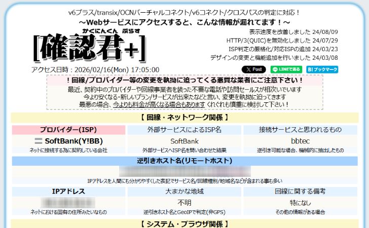 確認くんプラスは、現在利用しているインターネット接続情報を簡単に確認できるWebサービスです。